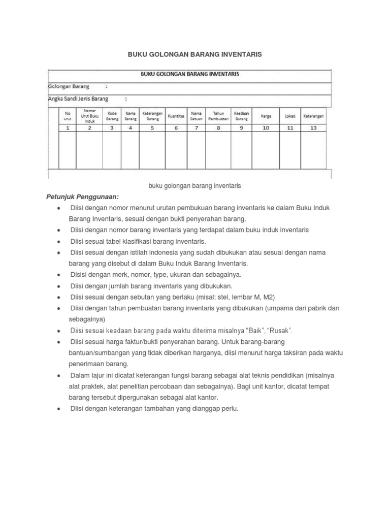 Buku barang pakai habis lampiran 11 e. Buku catatan barang non inventaris. Format ini dibuat dalam aplikasi excel yang mudah untuk dioperasikan. Download gratis format buku (catatan) inventaris barang disekolah dalam format word bisa untuk sd/mi, smp/mts, sma/smk dan ma supaya tertibnya administrasi sarana prasarana sekolah. Contoh buku induk barang inventaris beserta isinya. Contoh laporan inventaris barang sekolah.