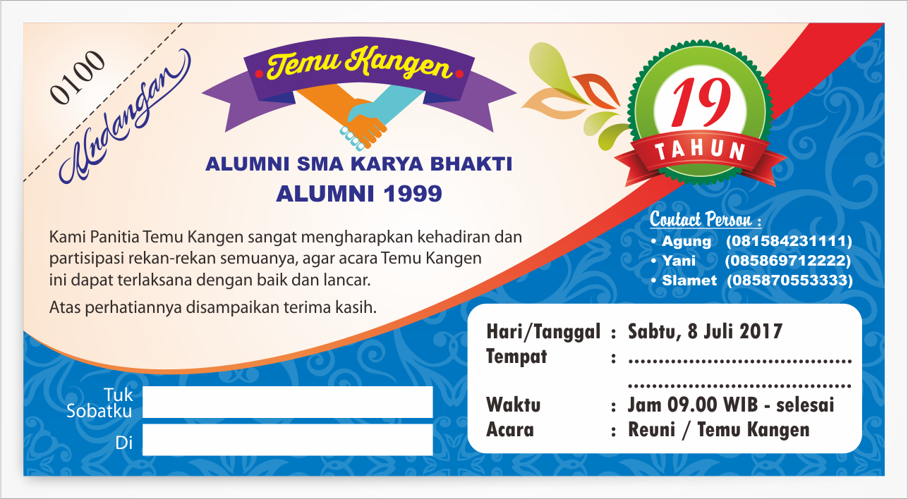 Contoh undangan reuni bahasa gaul. Assalammualaikum warahmatullaahi wa barakatuh, salam sejahtera bagi kita semua. Dedy enha visi reuni menyatukan potensi seluruh keluarga besar alumni smp negeri 1 karangmoncol angkatan 2006 misi reuni • meningkatkan solidaritas, kekeluargaan, silaturahmi dan komunikasi dikalangan angkatan • menjalin kerjasama antara sekolah dengan. Contoh kaos reuni smp yang digunakan dalam acara temu kangen angkatan 1998 yang ke 21 tahun setelah kelulusan alumni smp tarakanita Membentuk paguyuban alumni yang bisa mengoptimalkan komounikasi sesama alumni serta ikatan alumni smp negeri 1 manyar.
