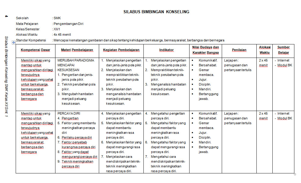 Pokok kegiatan, uraian kegiatan, sasaran, target, waktu, pendanaan, dan keterangan. Download rpp sbk sma dan ma kelas x, xi, xii semester 1 dan 2 berkarakter. Berikut ini kami bagikan silabus bk smp ktsp atau kurikulum 2006 untuk kelas 7, 8 dan 9 secara lengkap untuk digunakan di semester 1 dan 2. Silabus k13 bimbingan konseling (bk) kelas 12 sma revisi tahun 2020, yang digunakan saat ini ada yang sudah menerapakan kurikulum 2013. Adapun perangkat pembelajaran silabus yang akan saya bagikan disini yaitu sudah lengkap mulai dari silabus.