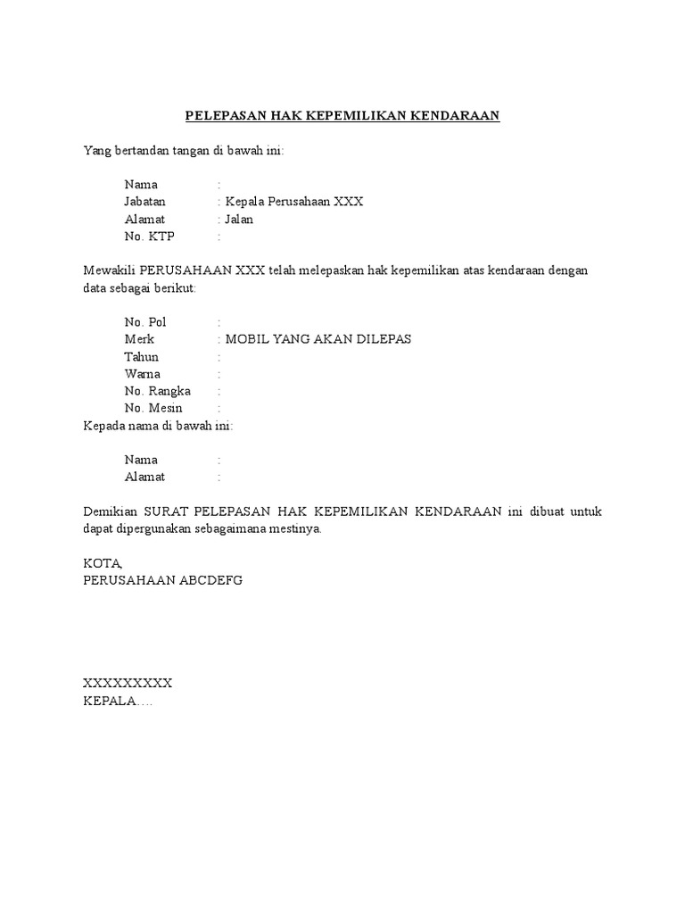 Surat pelepasan hak mobil pt itulah contoh surat pelepasan hak kendaraan pt yang dapat admin kumpulkan. Bisa juga ditambahkan ketentuan atau pasal tambahan. Adapun, penggunaan surat ini dibuat karena. Silahkan kunjungi artikel kami sebelumnya yaitu contoh. Surat pelepasan hak milik kendaraan merupakan surat yang dibuat oleh perusahaan yang akan melelang atau menjual mobil dinas atas nama perusahaan. Contoh surat pelepasan hak kendaraan atas nama perusahaan berbagi contoh surat.