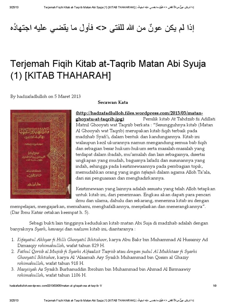 Ebook ini merupakan pelengkap pembelajaran di whatsapp group dirosah islamiyah gelombang 3 yang diampu oleh dr. Bagi kamu yang mencari download terjemah kitab fathul qorib lengkap pdf pdf maka localhost adalah tempat yang tepat untuk memulai. Kitab al ghayah wa at taqrib atau yang lebih dikenal sebagai matan abu syuja adalah kitab fikih ringkas milik mazhab syafi i yang dikarang oleh al qadhi abu syuja kitab matan al ghayah wa taqrib merupakan salah satu kitab terpenting dan umum dalam mengenali mazhab syafie. Semoga link download terjemahan itu trus berjaya dan sukses. Download & view terjemah matan abu syuja�.pdf as pdf for free. Terjemah matan abu syuja�.pdf [34wm3gr9gjl7].